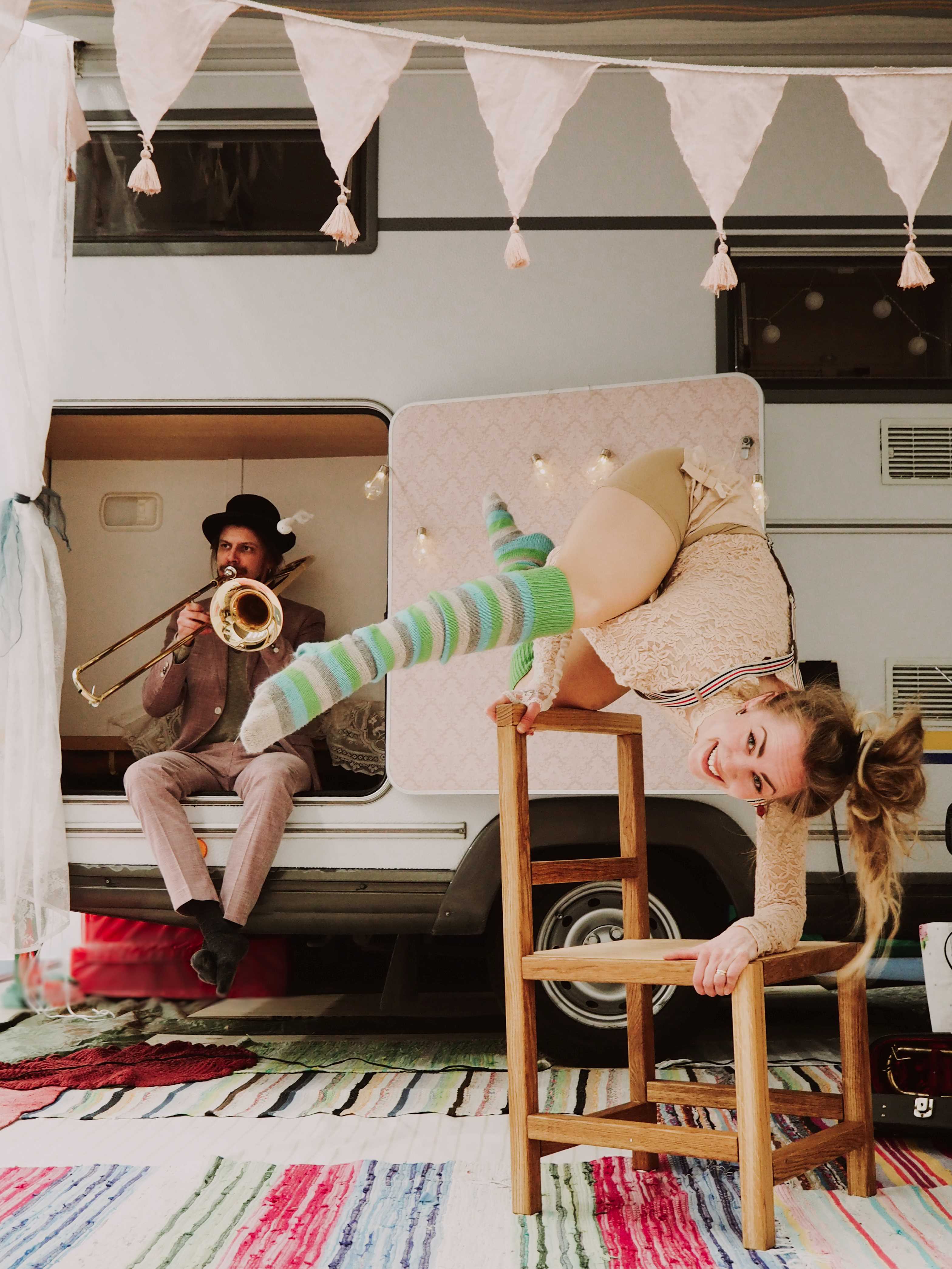 Muusikko Mikko-Ilari Ojala ja vanne- ja performanssitaiteilija Sara Airolan musiikista, vanteista, tuolista, kehoista, erinäisestä romusta ja asuntoautosta syntynyt teos kutsuu pysähtymään ja avaamaan aistit, hetkiseksi tai koko performanssin ajaksi.